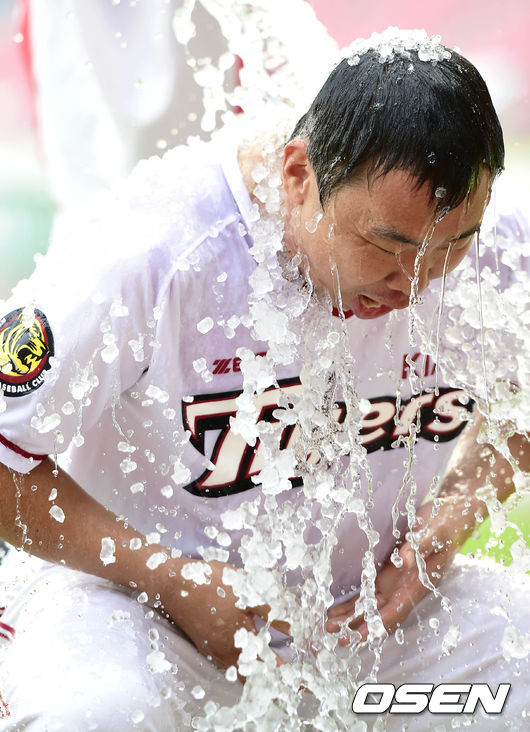 KIA 이범호가 얼음물 세례를 받고 있다. 이범호는 배칠수,고주원,이택근을 다음 참여자로 지목했다.