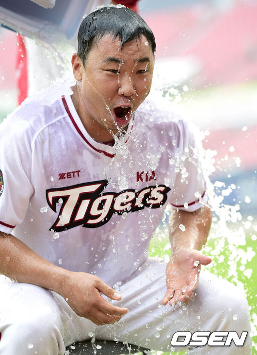 22일 오후 서울 잠실야구장에서 열린 '2014 한국야쿠르트 세븐 프로야구' LG트윈스와 KIA 타이거즈의 경기시작전 KIA 이범호가 아이스버킷 챌린지 캠페인에 참여했다.