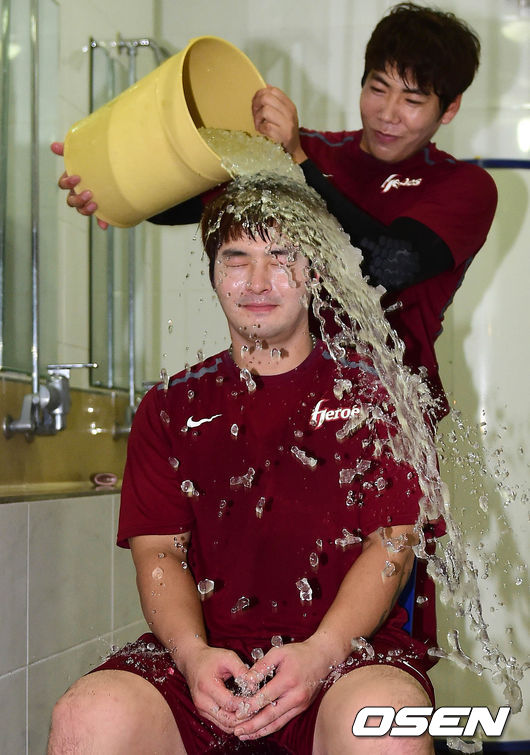 22일 오후 경남 창원 마산구장에서 열리는 '2014 한국야쿠르트 세븐 프로야구' NC 다이노스와 넥센 히어로즈의 경기 시작전 박병호가 아이스버킷챌린지에 동참하며 얼음물을 뒤집어 쓰고 있다.