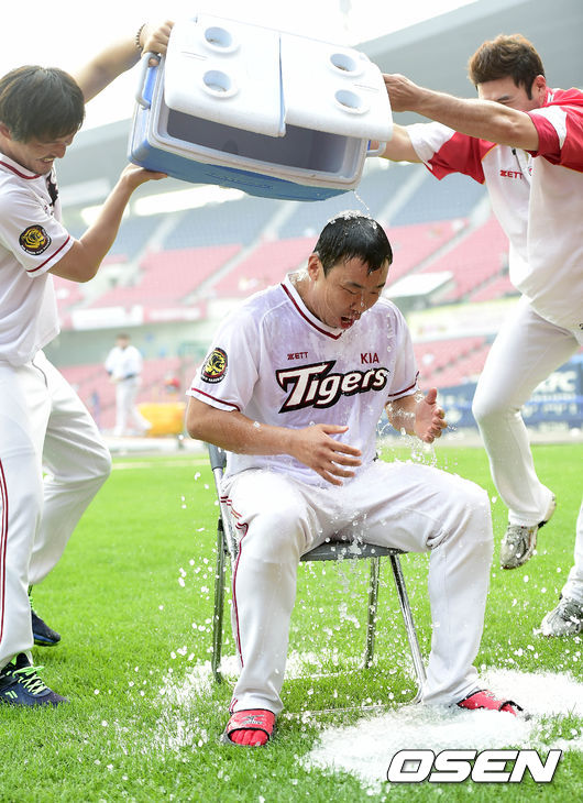 22일 오후 서울 잠실야구장에서 열린 '2014 한국야쿠르트 세븐 프로야구' LG트윈스와 KIA 타이거즈의 경기시작전 KIA 이범호가 아이스버킷 챌린지 캠페인에 참여했다.