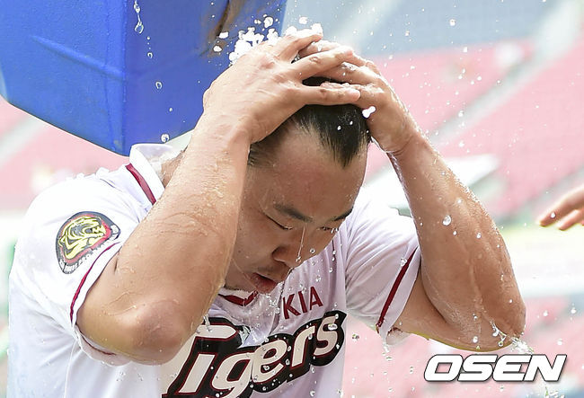 KIA 이범호가 얼음물 세례를 받고 있다. 이범호는 배칠수,고주원,이택근을 다음 참여자로 지목했다.