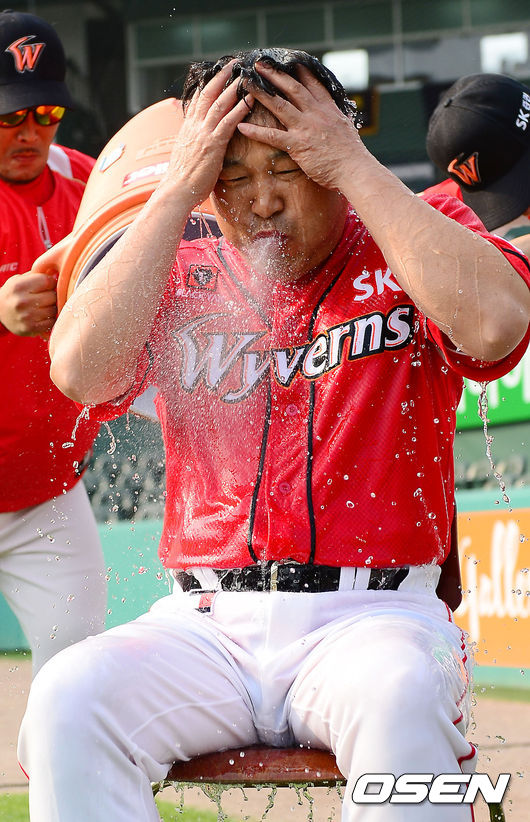 SK 이만수 감독이 아이스버킷챌린지를 마친 후 물을 뿜고 있다.