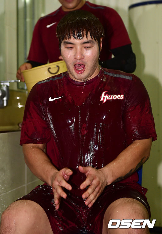 22일 오후 경남 창원 마산구장에서 열리는 '2014 한국야쿠르트 세븐 프로야구' NC 다이노스와 넥센 히어로즈의 경기 시작전 박병호가 아이스버킷챌린지에 동참하며 얼음물을 뒤집어 쓰고 있다.
