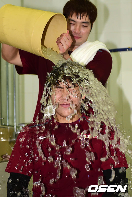 22일 오후 경남 창원 마산구장에서 열리는 '2014 한국야쿠르트 세븐 프로야구' NC 다이노스와 넥센 히어로즈의 경기 시작전 강정호가 아이스버킷챌린지에 동참하며 얼음물을 뒤집어 쓰고 있다.