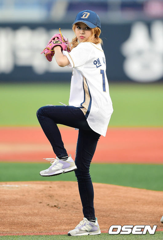 22일 오후 경남 창원 마산구장에서 열린 '2014 한국야쿠르트 세븐 프로야구' NC 다이노스와 넥센 히어로즈의 경기 시작전 앤씨아가 시구를 하고 있다.