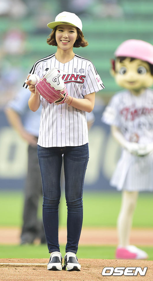 22일 오후 서울 잠실야구장에서 열린 '2014 한국야쿠르트 세븐 프로야구' LG트윈스와 KIA 타이거즈의 경기,경기시작전 XTM 연상은 아나운서가 시구를 하고 있다.