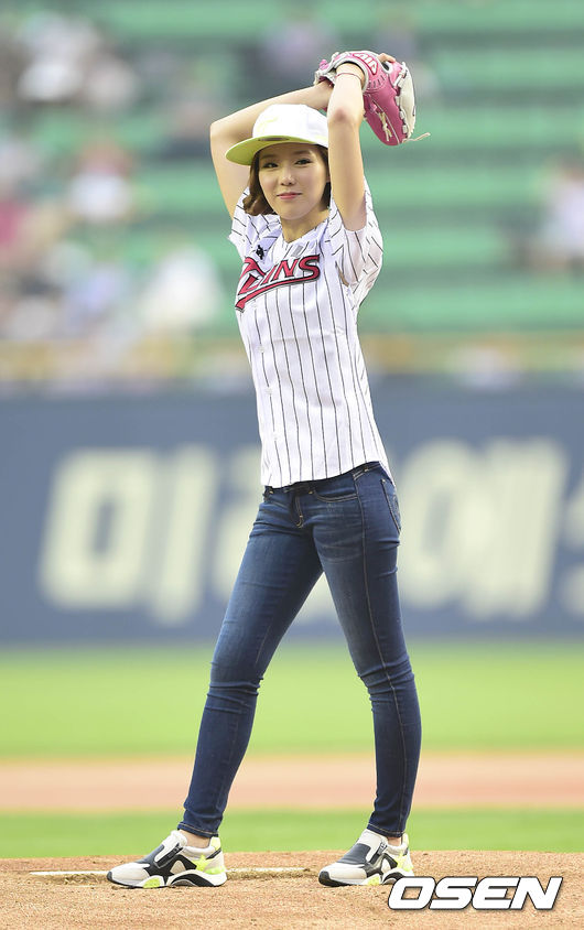 22일 오후 서울 잠실야구장에서 열린 '2014 한국야쿠르트 세븐 프로야구' LG트윈스와 KIA 타이거즈의 경기,경기시작전 XTM 연상은 아나운서가 시구를 하고 있다.