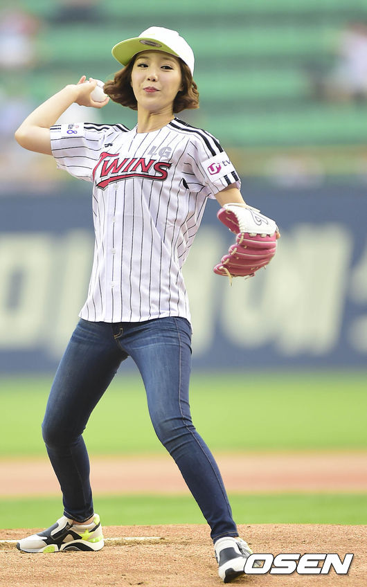22일 오후 서울 잠실야구장에서 열린 '2014 한국야쿠르트 세븐 프로야구' LG트윈스와 KIA 타이거즈의 경기,경기시작전 XTM 연상은 아나운서가 시구를 하고 있다.
