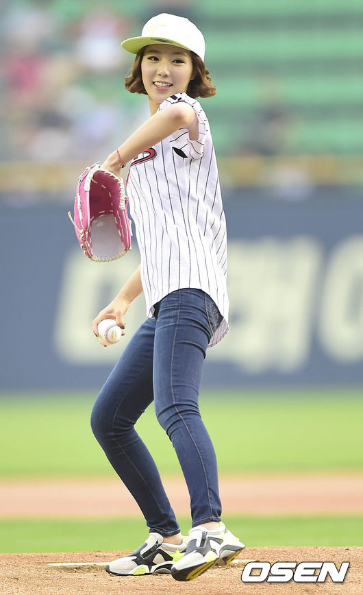 22일 오후 서울 잠실야구장에서 열린 '2014 한국야쿠르트 세븐 프로야구' LG트윈스와 KIA 타이거즈의 경기,경기시작전 XTM 연상은 아나운서가 시구를 하고 있다.