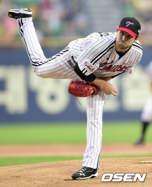 22일 오후 서울 잠실야구장에서 열린 '2014 한국야쿠르트 세븐 프로야구' LG트윈스와 KIA 타이거즈의 경기,1회초 LG 선발 투수 리오단이 힘차게 공을 던지고 있다.