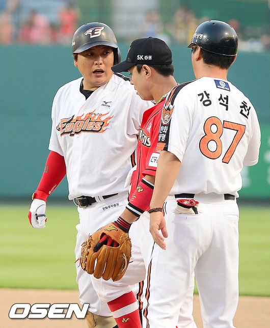22일 오후 대전 한밭야구장에서 열린 '2014 한국야쿠르트 세븐 프로야구' 한화 이글스와 SK 와이번스의 경기, 1회초 1사 주자 2,3루 한화 김태균이 우익수 앞 선취 1타점 적시타를 날린 후 1루에서 강석천 코치와 하이파이브를 하고 있다.