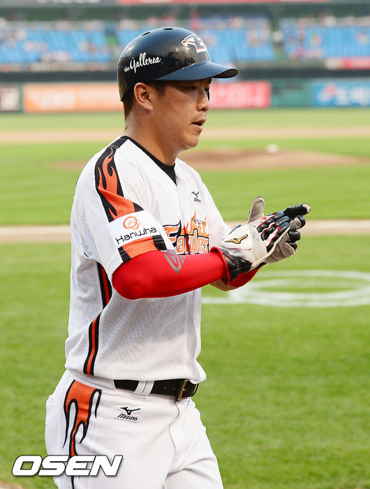 22일 오후 대전 한밭야구장에서 열린 '2014 한국야쿠르트 세븐 프로야구' 한화 이글스와 SK 와이번스의 경기, 1회초 1사 주자 2,3루 한화 김태균의 우익수 앞 선취 1타점 적시타때 홈을 밟은 정근우가 박수를 치며 덕아웃으로 들어오고 있다.