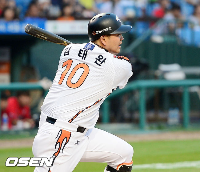 22일 오후 대전 한밭야구장에서 열린 '2014 한국야쿠르트 세븐 프로야구' 한화 이글스와 SK 와이번스의 경기, 1회초 2사 주자 1,3루 김태완이 중견수 앞 1타점 적시타를 날리고 있다.
