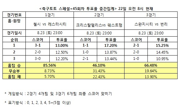 [축구토토] 국민체육진흥공단(www.kspo.or.kr)이 발행하는 체육진흥투표권 수탁사업자인 스포츠토토 공식 온라인 발매 사이트인 베트맨(www.betman.co.kr)은 오는 23일에 열리는 첼시-레스터시티(1경기), 크리스탈팰리스-웨스트햄(2경기), 스완지시티-번리(3경기)전 등 잉글랜드 프리미어리그 3경기를 대상으로 한 축구토토 스페셜+ 45회차 투표율 중간집계 결과, 축구팬의 85.56%는 첼시-레스터시티(1경기)전에서 첼시의 완승을 예상했다.