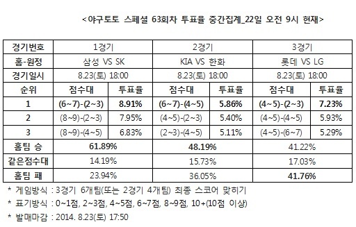 [야구토토] 국민체육진흥공단(www.kspo.or.kr)이 발행하는 체육진흥투표권 수탁사업자인 스포츠토토의 공식 온라인 발매 사이트 베트맨(www.betman.co.kr)이 오는 23일에 열리는 한국프로야구(KBO) 3경기를 대상으로 한 야구토토 스페셜 63회차 투표율을 중간 집계한 결과, 참가자의 61.89%는 삼성-SK(2경기)전에서 삼성이 SK에 승리할 것이라 예상했다.