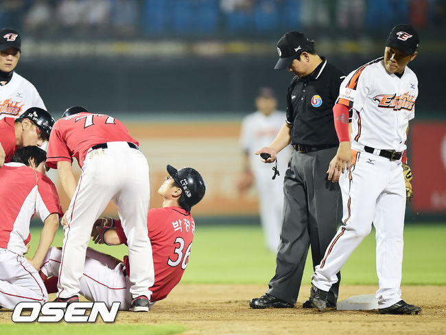 22일 오후 대전 한밭야구장에서 열린 '2014 한국야쿠르트 세븐 프로야구' 한화 이글스와 SK 와이번스의 경기, 4회초 무사 주자 2루 SK 나주환의 유격수 앞 땅볼 타구때 2루 주자 박정권이 귀루를 했으나 한화 2루수 정근우에게 태그를 당하며 아웃을 당했다. 이때 박정권이 손가락의 고통을 호소하고 있다.