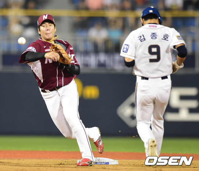 22일 오후 경남 창원 마산구장에서 열린 '2014 한국야쿠르트 세븐 프로야구' NC 다이노스와 넥센 히어로즈의 경기 6회말 무사 1루 이종욱의 병살타를 강정호가 2루에서 김종호를 포스아웃 시키고 1루로 송구하고 있다.