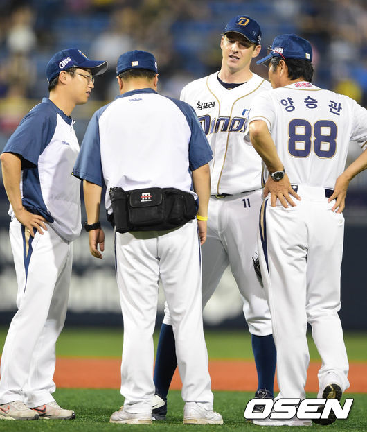 22일 오후 경남 창원 마산구장에서 열린 '2014 한국야쿠르트 세븐 프로야구' NC 다이노스와 넥센 히어로즈의 경기 7회초 선두타자 박병호의 타구에 몸을 맞은 찰리가 트레이너와 몸상태를 체크 하고 있다.