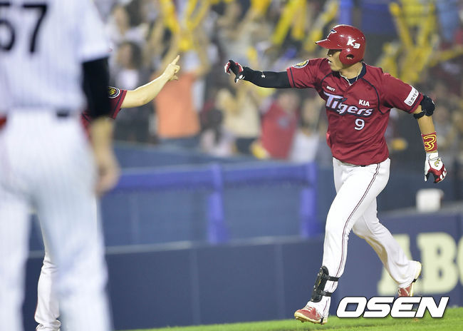 22일 오후 서울 잠실야구장에서 열린 '2014 한국야쿠르트 세븐 프로야구' LG트윈스와 KIA 타이거즈의 경기,7회초 1사 주자 2루 KIA 김민우가 좌측담장을 넘어가는 2점 홈런을 치고 3루코치와 세리모니를 하고 있다.