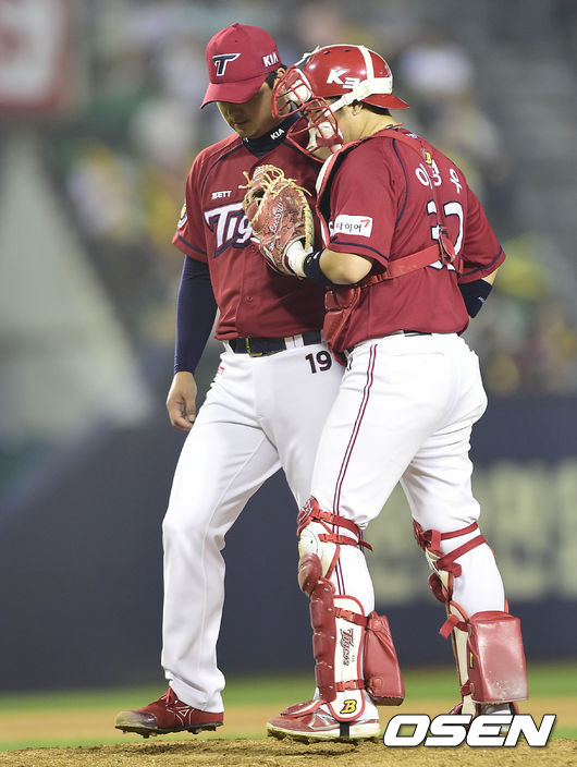 22일 오후 서울 잠실야구장에서 열린 '2014 한국야쿠르트 세븐 프로야구' LG트윈스와 KIA 타이거즈의 경기, 7회말 2사 주자 2루 KIA 이성우 포수가 마운드를 방문하고 있다.