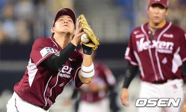 22일 오후 경남 창원 마산구장에서 열린 '2014 한국야쿠르트 세븐 프로야구' NC 다이노스와 넥센 히어로즈의 경기 8회말 2사 만루 대타 조영훈의 뜬공을 김민성이 잡고 있다.