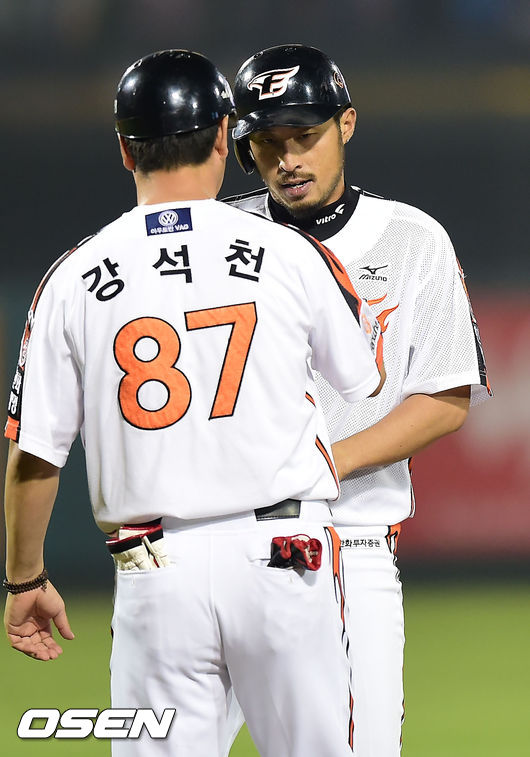 22일 오후 대전 한밭야구장에서 열린 '2014 한국야쿠르트 세븐 프로야구' 한화 이글스와 SK 와이번스의 경기, 6회말 2사 주자 3루 한화 김경언이 좌익수 왼쪽 1타점 적시타를 날린 후 1루에서 강석천 코치와 하이파이브를 하고 있다.