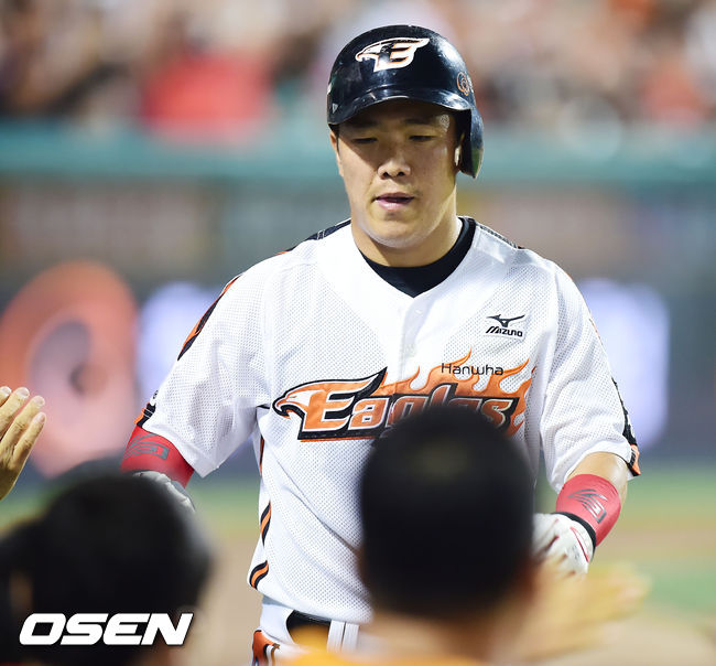 22일 오후 대전 한밭야구장에서 열린 '2014 한국야쿠르트 세븐 프로야구' 한화 이글스와 SK 와이번스의 경기, 6회말 2사 주자 3루 한화 김경언의 좌익수 왼쪽 1타점 적시타때 홈을 밟은 정근우가 덕아웃에서 동료들과 하이파이브를 하고 있다.