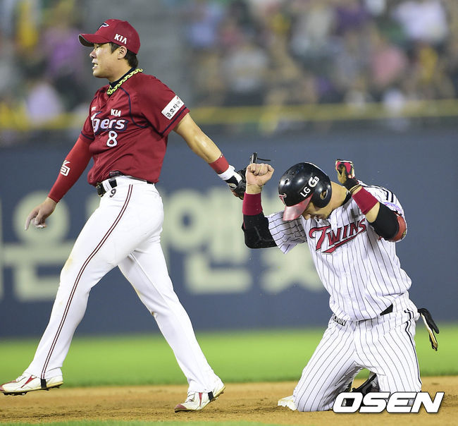 22일 오후 서울 잠실야구장에서 열린 '2014 한국야쿠르트 세븐 프로야구' LG트윈스와 KIA 타이거즈의 경기, 8회말 LG 손주인이 2루타를 치고 2루에서 환호하고 있다.
