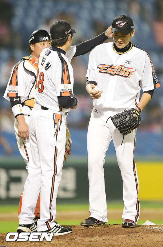 이태양,'정민철 코치의 격려를 받으며 교체'