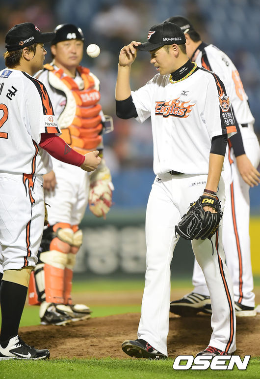 22일 오후 대전 한밭야구장에서 열린 '2014 한국야쿠르트 세븐 프로야구' 한화 이글스와 SK 와이번스의 경기, 7회초 2사 주자 2루 SK 최정 타석에서 한화 선발 이태양이 교체되고 있다.