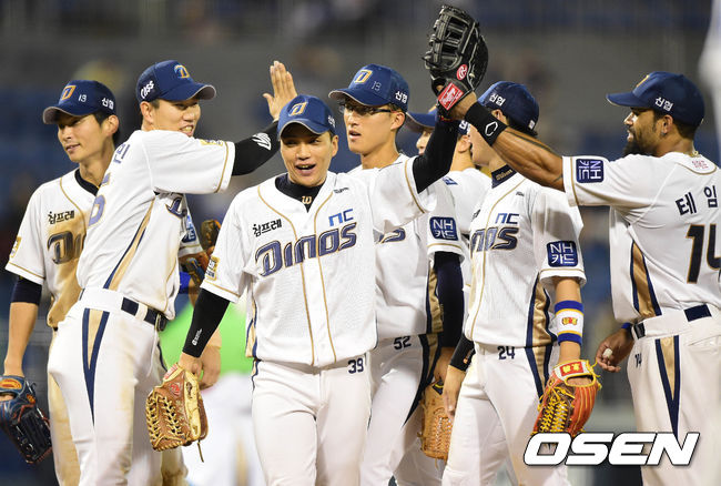 22일 오후 경남 창원 마산구장에서 열린 '2014 한국야쿠르트 세븐 프로야구' NC 다이노스와 넥센 히어로즈의 경기 종료 후 NC 선수들이 하이파이브를 하고 있다.