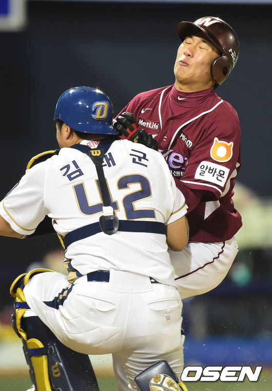 22일 오후 경남 창원 마산구장에서 열린 '2014 한국야쿠르트 세븐 프로야구' NC 다이노스와 넥센 히어로즈의 경기 9회초 2사 1,3루 김민성 타석, 3루주자 김하성이 이중도루 시도 중 홈에서 태그아웃 당하고 있다.