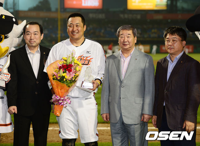 22일 오후 대전 한밭야구장에서 열린 '2014 한국야쿠르트 세븐 프로야구' 한화 이글스와 SK 와이번스의 경기, 클리닝 타임때 한화 조인성의 프로통산 2,000루타 달성 및 2,000경기 출장 기념식이 진행되고 있다.