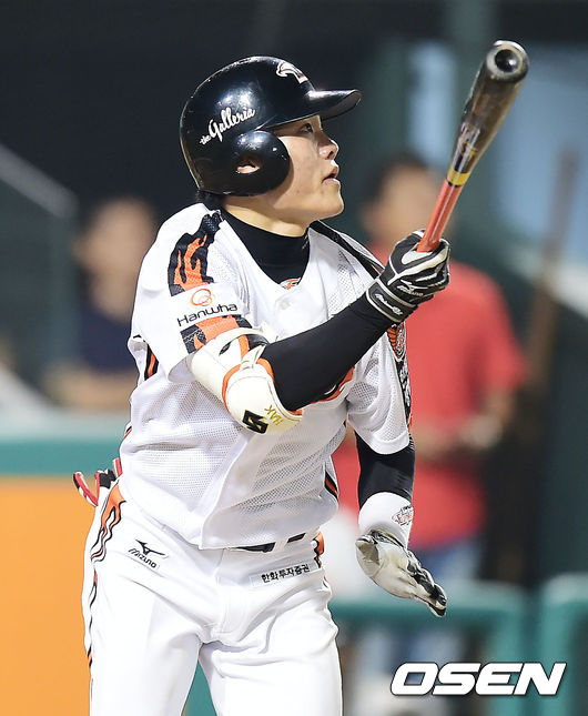 22일 오후 대전 한밭야구장에서 열린 '2014 한국야쿠르트 세븐 프로야구' 한화 이글스와 SK 와이번스의 경기, 7회말 1사 주자 2루 한화 강경학이 좌중간 1타점 3루타를 날리고 있다.