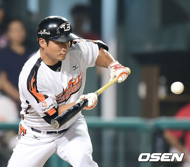 22일 오후 대전 한밭야구장에서 열린 '2014 한국야쿠르트 세븐 프로야구' 한화 이글스와 SK 와이번스의 경기, 8회말 무사 주자 1,2루 한화 정현석이 희생번트에 성공하고 있다.