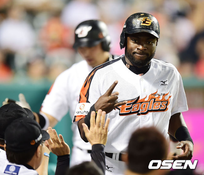 22일 오후 대전 한밭야구장에서 열린 '2014 한국야쿠르트 세븐 프로야구' 한화 이글스와 SK 와이번스의 경기, 8회말 1사 주자 2,3루 한화 조인성의 우중간 2타점 적시타때 홈을 밟은 피에와 김태완이 덕아웃에서 동료들과 하이파이브를 하고 있다.