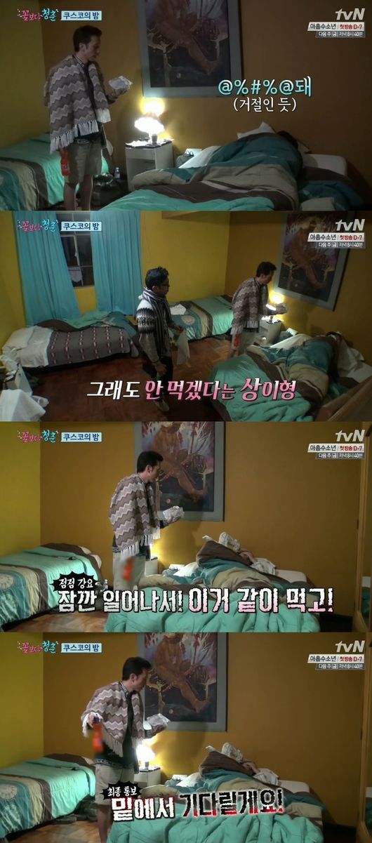 유희열은 22일 방송된 tvN 예능프로그램 ‘꽃보다 청춘’ 4회에서 고산병과 몸살 기운으로 아픈 윤상이 식사를 하지 않고 누워있자 “일어나서 먹고 다시 자라. 우리 밑에서 기다리겠다”라고 음식을 먹이려고 했다.