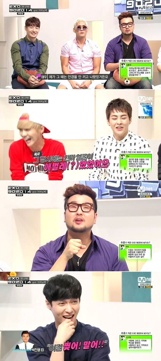 박준형은 22일 오후 방송된 Mnet 예능프로그램 ‘엑소 902014’에서 김태우가 “제가 데뷔 때에는 안경을 안 끼고 나왔다”라고 말하자, “그 당시에는 진짜 얼굴이 애벌레였다”라고 말해 폭소케 했다.