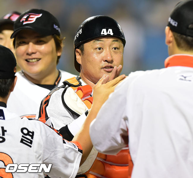 경기를 마치고 한화 조인성이 동료들과 기쁨을 나누고 있다. / rumi@osen.co.kr