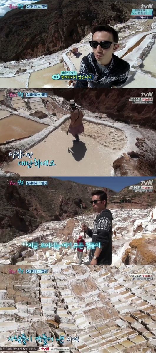 유희열은 22일 방송된 tvN 예능프로그램 ‘꽃보다 청춘’ 4회에서 살리네라스 염전을 지켜본 후 어렵게 밑으로 내려가 경관을 살폈다.