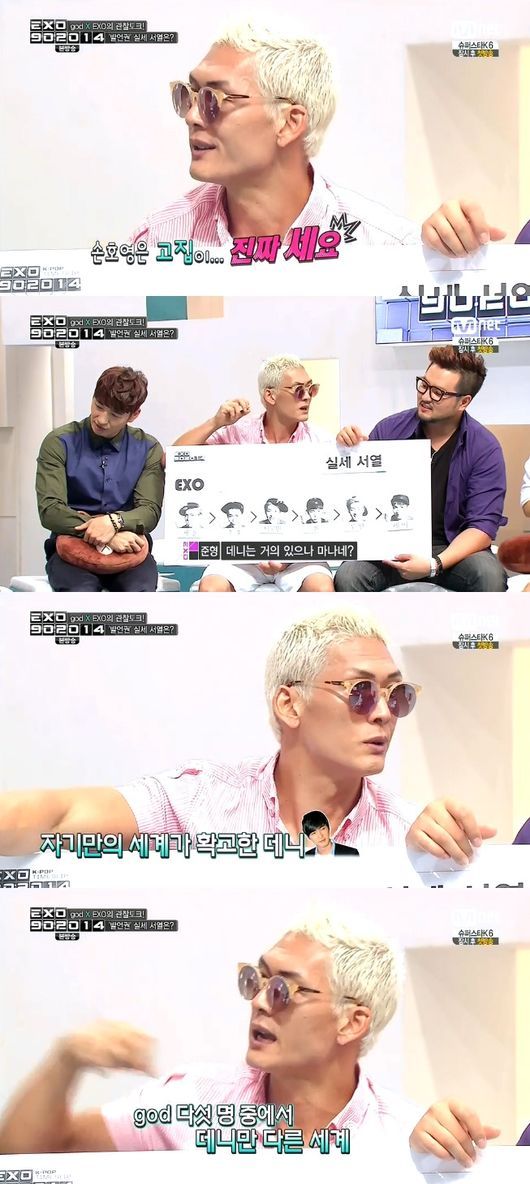 이날 박준형은 엑소가 지오디의 서열을 '김태우>손호영>데니안>윤계상>박준형' 순으로 매긴 것을 보고 "손호영은 고집이 진짜 세다"라고 폭로해 손호영을 당황케 했다.