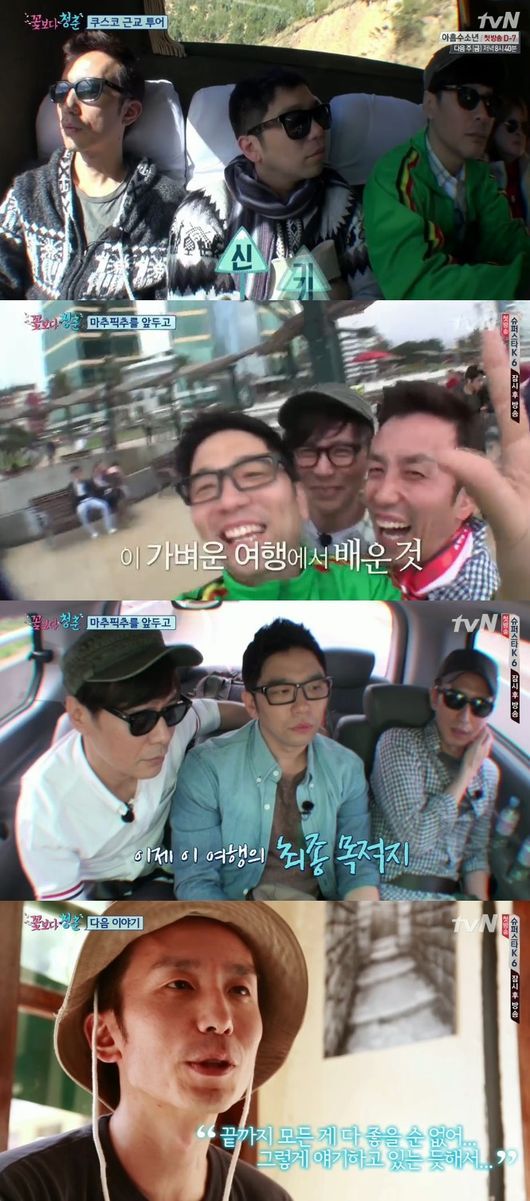 22일 방송된 tvN 예능프로그램 ‘꽃보다 청춘’ 4회는 페루 쿠스코 근교 투어를 하는 윤상, 유희열, 이적의 모습이 담겼다. 전날 쿠스코에 도착하는 과정에서 고산병에 시달렸던 윤상은 하룻밤 쉬고 버스 투어를 시작한 후 건강을 회복한 모습이었다. 아파서 입맛이 없는 윤상을 반강제적으로 일어나게 해서 음식을 먹이는 유희열의 거칠지만 따뜻한 배려에서 세 남자의 끈끈한 우정을 확인할 수 있었다.
