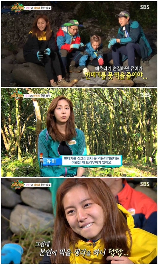 이날 유이는 애벌레 시식을 앞두고 유난히 약한 모습을 보였다. 지렁이도 손으로 덥석 잡고, 물고기 사냥에도 거침없는 유이였기에 의외의 모습이었다. 유이는 제작진과 인터뷰에서 "번데기를 못 먹는다. 징그럽기 보다는 어렸을 때 먹다가 번데기가 목에 걸려서 죽을 뻔한 적이 있다. 잡는 거, 까는 거는 괜찮은데, 먹는 데 대한 걱정이 많았다. 트라우마가 있었다. 그래서 애벌레도 못 먹겠구나 싶었다"고 말했다.