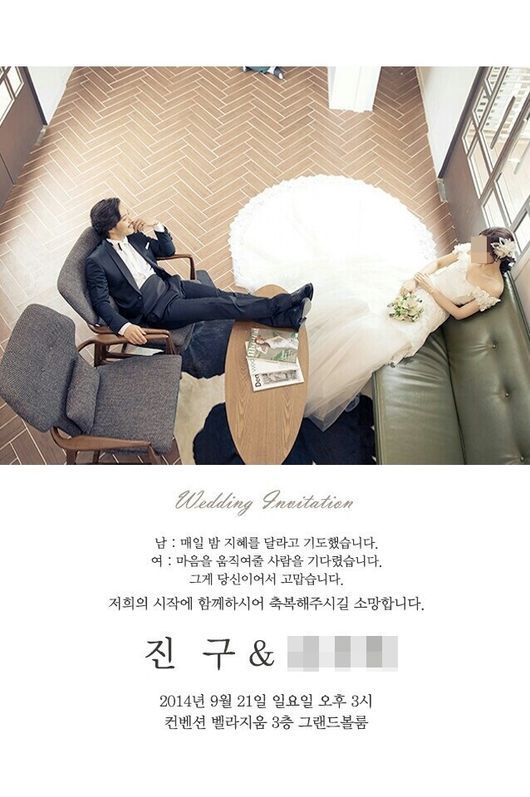 23일 공개된 진구의 청첩장에는 예비신부와 함께 한 웨딩화보가 담겨 있어 눈길을 끈다. 서로를 행복하게 바라보는 예비 신랑신부의 모습은 보는 이들의 시선을 사로잡는다. 특히 청첩장에 들어간 문구가 두 사람의 결혼을 더욱 로맨틱하게 만들어 이목을 집중시킨다.