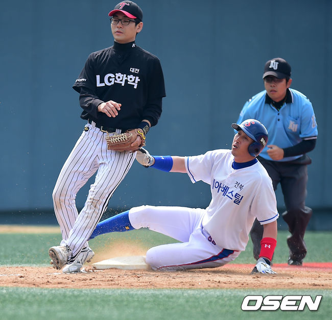 23일 전라북도 군산시 사정동 월명야구장에서 열린 제1회 KBO총재배 시도대항 전국 직장인 야구대회 4강전 전북 세아베스틸과 대전 LG 화학의 경기, 1회초 무사 주자 2루 세아베스틸의 김희철 타석때 2루 주자 류재건이 3루 도루에 성공하고 있다.