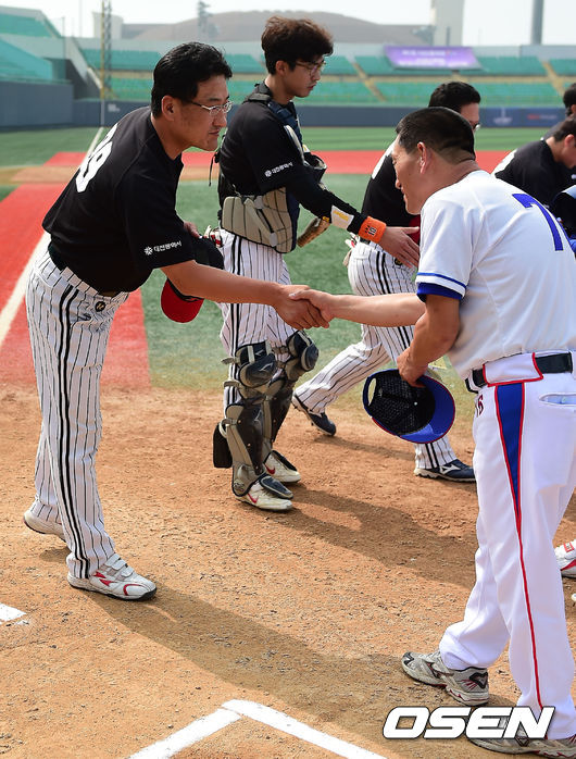 23일 전라북도 군산시 사정동 월명야구장에서 열린 제1회 KBO총재배 시도대항 전국 직장인 야구대회 4강전 전북 세아베스틸과 대전 LG 화학의 경기, LG화학 김성진 감독과 세아베스틸 최광웅 감독이 악수를 나누고 있다.