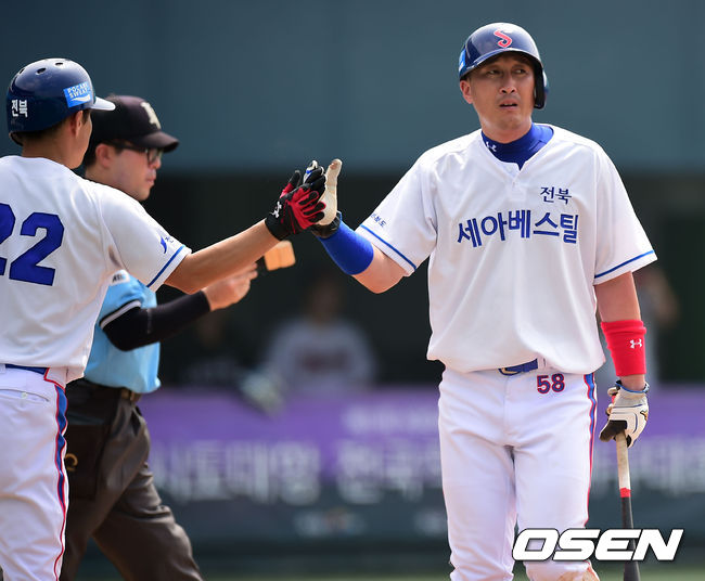 23일 전라북도 군산시 사정동 월명야구장에서 열린 제1회 KBO총재배 시도대항 전국 직장인 야구대회 4강전 전북 세아베스틸과 대전 LG 화학의 경기, 3회초 1사 주자 3루 세아베스틸의 조광현의 땅볼 타구때 3루 주자 류재건이 홈에서 세이프된 후 기뻐하고 있다.