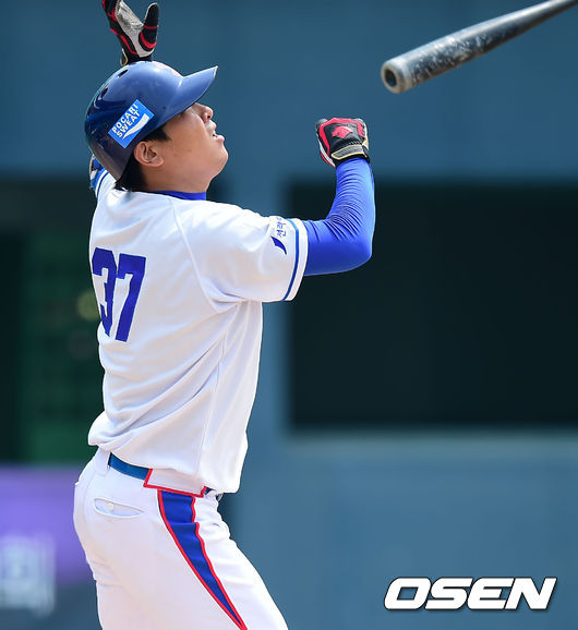 23일 전라북도 군산시 사정동 월명야구장에서 열린 제1회 KBO총재배 시도대항 전국 직장인 야구대회 4강전 전북 세아베스틸과 대전 LG 화학의 경기, 5회초 무사 주자 3루 세아베스틸 김희철이 우익수 플라이타구를 날리며 1타점을 올리고 있다.