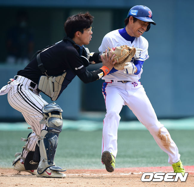 23일 전라북도 군산시 사정동 월명야구장에서 열린 제1회 KBO총재배 시도대항 전국 직장인 야구대회 4강전 전북 세아베스틸과 대전 LG 화학의 경기, 6회말 1사 주자 3루 세아베스틸 김상곤 타석에서 볼 빠졌을때 3루 주자 조병헌이 홈으로 쇄도, 태그아웃 당하고 있다.