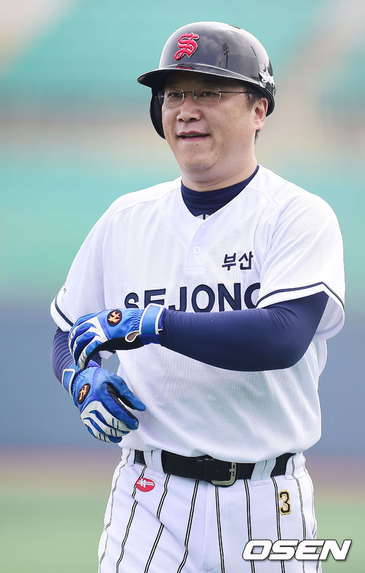 전국 직장인 야구대회 4강전 부산 세종공업과 경남 삼성테크윈 경기, 1회초 2사 주자 2,3루 세종공업 김태형이 땅볼 타구를 날리며 아웃 된 후 아쉬워하고 있다.